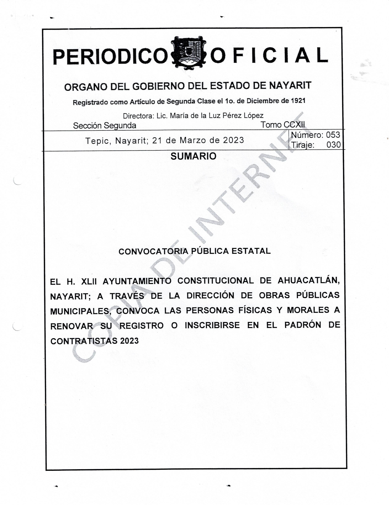 CONVOCATORIA PÚBLICA ESTATAL EL H. XLII AYUNTAMIENTO CONSTITUCIONAL DE AHUACATLÁN, NAYARIT; A TRAVÉS DE LA DIRECCIÓN DE OBRAS PÚBLICAS MUNICIPALES, CONVOCA LAS PERSONAS FÍSICAS Y MORALES A RENOVAR SU REGISTRO O INSCRIBIRSE EN EL PADRÓN DE CONTRATISTAS 2023